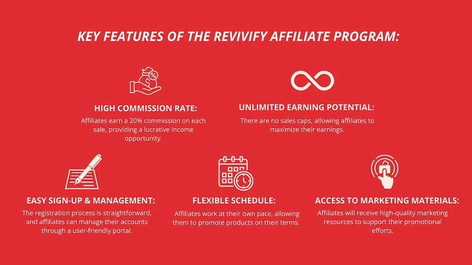 The program is open to a wide range of individuals and organizations, including healthcare professionals, wellness centers, fitness trainers, and health enthusiasts. Whether you’re looking to earn extra income or promote a healthier lifestyle, the Revivify Affiliate Program offers a unique opportunity to make a positive impact.